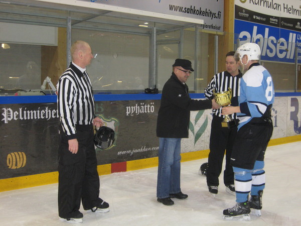 Lasse Lonka luovuttaa kiertopalkinnon Bearsin kapteenille Mikko Hortolle.