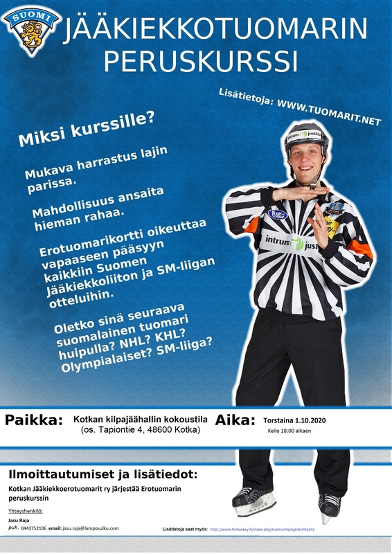 Oletko sinä seuraava suomalainen tuomari huipulla? Liiga? KHL? NHL? Olympialaiset? Haluatko osaksi Suomen suosituinta lajia? Haluatko sekä fyysisesti että henkisesti haastavan harrastuksen? Haluatko harrastuksen, jossa voit tienata taskurahaa liikkumalla ja ilmaisen sisäänpääsyn Liigan ja Suomen Jääkiekkoliiton alaisiin peleihin? Ilmoittautumiset ja lisätiedot: Jasu Raja puh. 044 375 2106